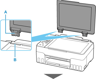 Sobitage dokumendikaane hinged (A) hoidikusse (B) ja sisestage mõlemad dokumendikaane hinged vertikaalselt, nagu näidatud alloleval joonisel.