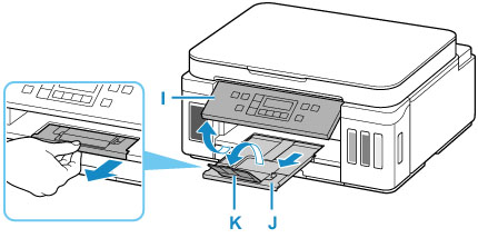 11. Avage juhtpaneel (I), tõmmake välja paberi väljastusalus (J) ja avage väljastusaluse pikendus (K).