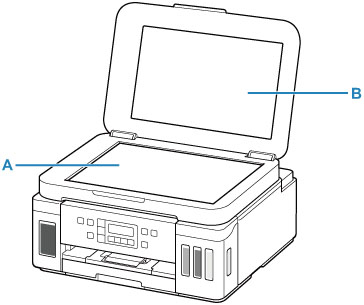 Kasutage pehmet, kuiva ja ebemevaba lappi. Pühkige õrnalt kopeerimisalust (A) ja dokumendikaane (valge leht) (B) sisemist külge. Pühkige ära kogu mustus, eriti klaaspinnalt.
