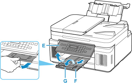 Avaa käyttöpaneeli (E) ja vedä sitten ulos paperin luovutustaso (F) ja avaa sitten luovutustason jatke (G).