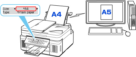 - Esimerkiksi, jos tulostuksen/kopioinnin paperikokoasetuksena on A5 ja tulostimeen rekisteröity paperitieto on A4, tulostin aloittaa tulostuksen/kopioinnin käyttäen takalokeroon tai kasettiin asetettua paperia muuttamatta tulostuksen/kopioinnin paperikokoasetusta.