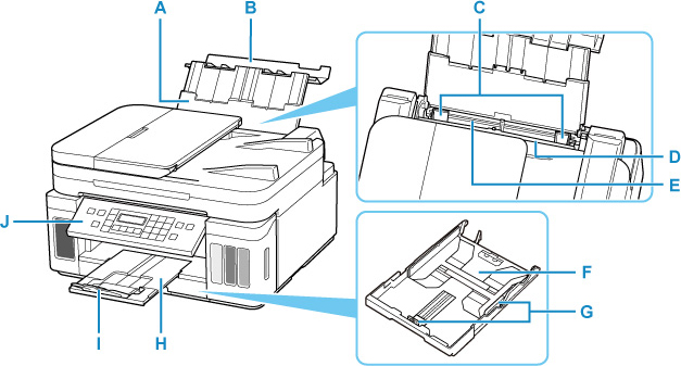 - Tulostettavat paperit tulevat ulos tästä. Vedä luovutustaso ulos ennen tulostamista.