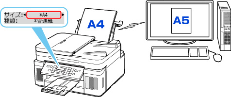 - 例えば、印刷/コピー時の用紙サイズの設定がA5サイズで、給紙時にA4サイズと登録していた場合、後トレイまたはカセットの用紙をA5サイズの用紙に交換してから印刷/コピーします。