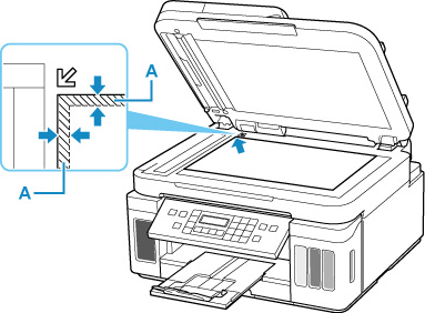 Skrivaren kan inte skanna det randiga området (A) (1 mm (0,04 tum) från glasets kanter).