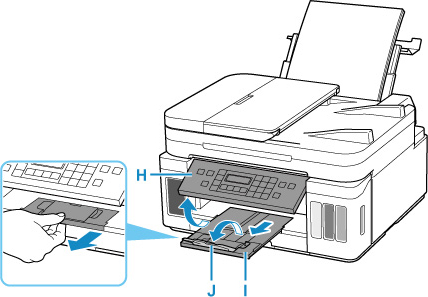 11. เปิดแผงการทำงาน (H) ดึงเทรย์ออกกระดาษ (I) ออกมา จากนั้นเปิดส่วนขยายของเทรย์ออกกระดาษ (J)