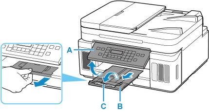 Avage juhtpaneel (A), tõmmake välja paberi väljastusalus (B) ja avage väljastusaluse pikendus (C).