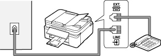 Prieš jungdami telefoną prie spausdintuvo įsitikinkite, kad spausdintuvas išjungtas. Vieną modulinio jungiamojo kabelio galą prijunkite prie išorinio įtaiso lizdo (šalia spausdintuvo žymės EXT.), kitą – prie telefone esančio telefono linijos lizdo.