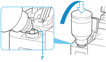 Lijn de punt van de inktfles uit met de inlaat van de printer (F), beweeg de inktfles langzaam ondersteboven en duw de fles in de inlaat.