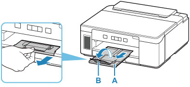 Trek de papieruitvoerlade (A) uit en open het verlengstuk van de uitvoerlade (B).