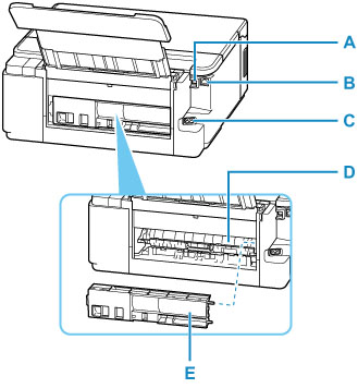 - Sluit hier de LAN-kabel aan om de printer met een LAN te verbinden.