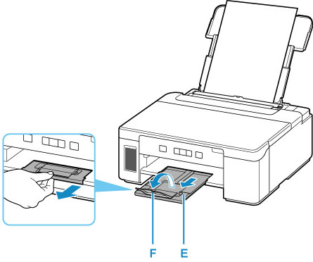 Trek de papieruitvoerlade (E) uit en open het verlengstuk van de uitvoerlade (F).