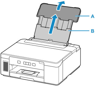 Open de klep van de achterste lade (A). Trek de papiersteun (B) recht omhoog en vouw deze naar achteren.
