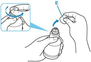 Ţineţi sticla de cerneală în poziţie verticală şi răsuciţi uşor capacul sticlei (E) pentru a-l scoate.