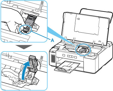 Pak knop (A) op het sluitklepje van de printkop vast om het te openen.