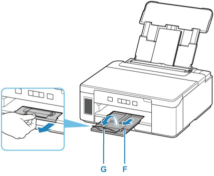 Trek de papieruitvoerlade (F) uit en open het verlengstuk van de uitvoerlade (G).