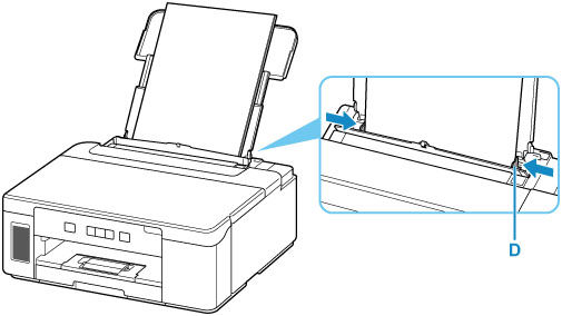 Glisaţi ghidajul pentru hârtie (D) din dreapta pentru a deschide ambele ghidaje pentru hârtie.