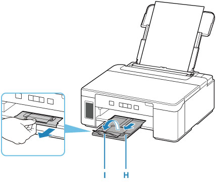 Trageţi afară tava de ieşire a hârtiei (H) şi deschideţi extensia tăvii de ieşire (I).