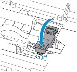 Împingeţi în jos capacul de blocare a capului de imprimare, până când se fixează cu un clic.