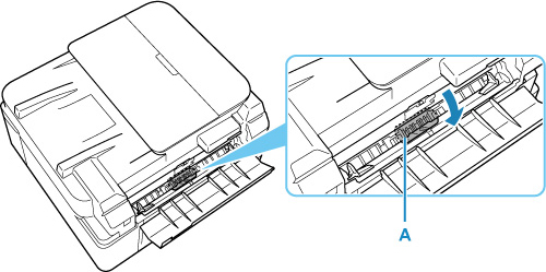În timp ce rotiţi rolele de alimentare cu hârtie (A) situate în interiorul tăvii din spate mai mult de două ture, ştergeţi-le cu o cârpă bine stoarsă după umezire.