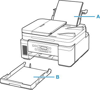 Skrivaren har två papperskällor som matar papper: det bakre facket (A) och kassetten (B).