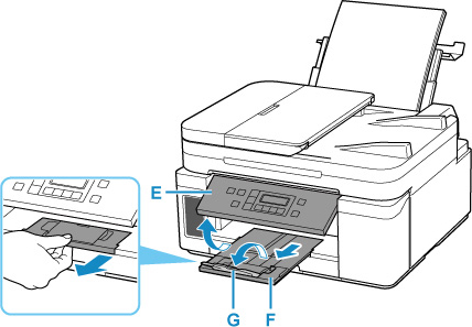 7. Mở bảng thao tác (E), kéo khay giấy ra (F) ra, rồi mở phần mở rộng khay giấy ra (G).