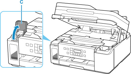 Deschideţi capacul rezervorului de cerneală (C).