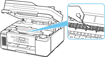 Dacă problema nu se rezolvă după ce efectuaţi din nou curăţarea, este posibil ca ieşiturile din interiorul imprimantei să fie pătate. Ştergeţi cerneala de pe ieşituri utilizând un tampon de bumbac sau ceva asemănător.
