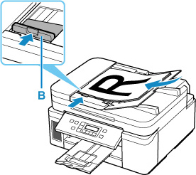 Điều chỉnh thanh dẫn tài liệu (B) để khớp với chiều rộng của tài liệu.