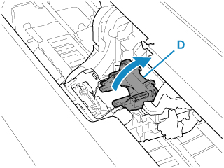 Greifen Sie den Deckel (D) der Verriegelung für den Druckkopf und senken Sie ihn nach vorne ab, um den Druckkopf zu verriegeln.