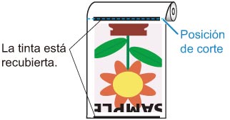 Si el papel tiende a generar polvo cuando se corta, como con la película para luz posterior, puede reducir las motas de polvo estableciendo Reducción de corte de polvo (Cut-dust reduction) en ON, en el menú del panel de control, lo que cubrirá los bordes inicial y de salida del documento con tinta. Como resultado, puede reducir los problemas relacionados con el cabezal de impresión. Puede establecer Reducción de corte de polvo en función del tipo de soporte.