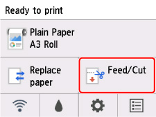 Toque el área de visualización de configuración del papel >Alimentar/cortar (Feed/Cut)>Cortar papel (Cut paper)>Sí (Yes)