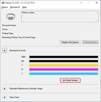 Haga clic en la información de Número del modelo de tinta (Ink Model Number).