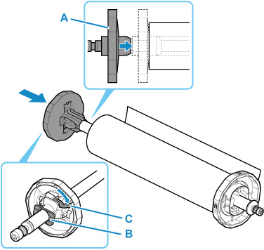 Inserire il blocco supporto nel supporto per rotolo, procedendo da sinistra come mostrato nella figura; mantenerlo quindi nella posizione (B) e spingerlo a fondo finché la flangia del blocco supporto (A) non tocca la carta in rotolo. Bloccare la leva (C) del blocco supporto ruotandola verso