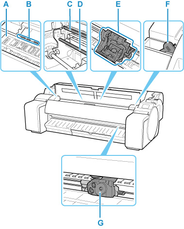 - Sposta la testina di stampa. Il carrello svolge un ruolo chiave nella stampa. (Vedere "Carrello".)