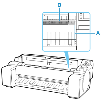 용지의 오른쪽 가장자리를 프린터 오른쪽 용지 맞춤선(A)의 연장선에 맞추고 인쇄를 시작할 위치를 플래튼 끝부분의 홈(B)에 맞춰 용지를 로드합니다.
