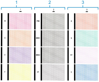 Prüfen Sie das Düsentestmuster, und wählen Sie eine Tintengruppe aus, für die bei Bedarf eine Reinigung durchgeführt werden soll. Sie können jeden Druckkopf reinigen oder das Muster unten wählen, um den Druckkopf mit einer verstopften Düse zu reinigen.