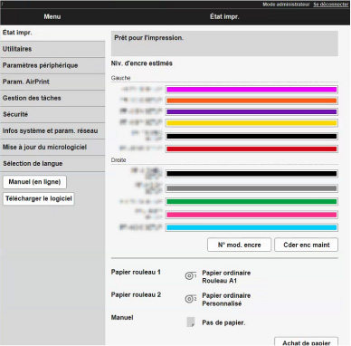 Cette fonction affiche des informations sur l'imprimante, telles que la quantité d'encre restante, l'état de la machine et des informations détaillées sur les erreurs.