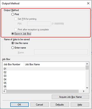 Selezionare Salva in casella lavoro (Save in Job Box) in Metodo di output (Output Method).