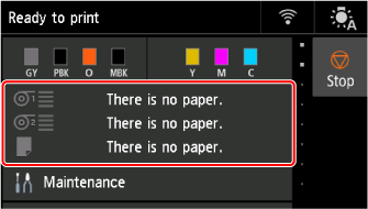 Cuando Aliment. auto. de rollo de papel (Roll paper auto feed) se establece en Activar (Enable) y colocar el soporte del rollo sin el rollo de papel cargado en el soporte del rollo, aparece Preparando para alimentarel papel... (Preparing to feed the paper...) en el panel de control. En este caso, pulse el botón Parar en el panel de control para cancelar la alimentación.