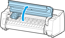 Sujete el gancho (F) y abra la cubierta de bloqueo del cabezal de impresión.