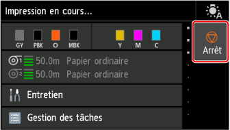 Pour annuler l'impression ou la réception de tâches d'impression, appuyez sur Arrêt (Stop) sur l'écran tactile.