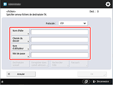 Saisissez "./folderN" dans Chemin du dossier. ("N" représente le numéro des paramètres d'impression spécifié dans l'écran Param d'impr directs depuis FTP sur l'imprimante.) Par exemple, pour saisir le chemin d'accès pour Paramètres d'impression 1, saisissez "./folder1". Pour Paramètres d'impression 2, saisissez "./folder2".
