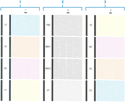 Consultez le motif de vérification des buses et sélectionnez un groupe d'encre à nettoyer. Vous pouvez nettoyer toutes les têtes d'impression ou sélectionner le motif ci-dessous pour nettoyer la tête d'impression contenant une buse obstruée.