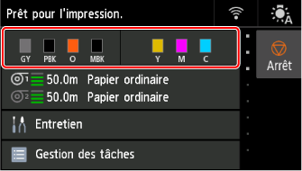 - Il est également possible de remplacer une cartouche d'encre en cours d'impression, en cas d'annulation des travaux d'impression ou lorsque le papier est avancé.