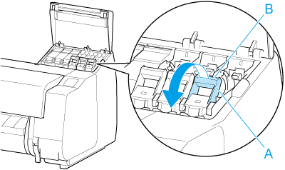 Tirez vers vous la poignée (A) du levier de verrouillage du réservoir d'encre de la couleur à remplacer tout en appuyant sur le bouton situé à l'arrière de la poignée (B).