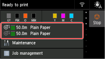 Se o código de barras no rolo não for detectado, insira o tipo de mídia e o comprimento no painel de controle. O comprimento do papel neste momento pode ser definido em Comp. do rolo (alterar padrão).