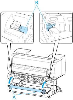 Удерживайте фланцы (A) так, чтобы ограничитель держателя был слева, выровняйте вал держателя рулона по левому и правому направляющим пазам отверстия держателя рулона (B) и загрузите рулон.