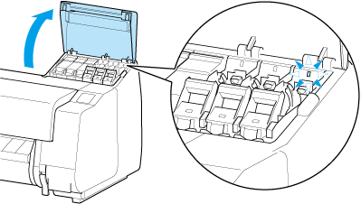 Потяните фиксирующий рычаг чернильного контейнера вверх.
