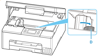 Gire la palanca de válvula de tinta (D) hacia la derecha.