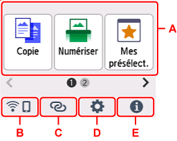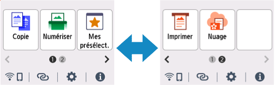 Appuyez sur l'écran ACCUEIL sur l'écran tactile avec votre doigt pour sélectionner des menus pour copier, numériser et accéder à d'autres fonctions.